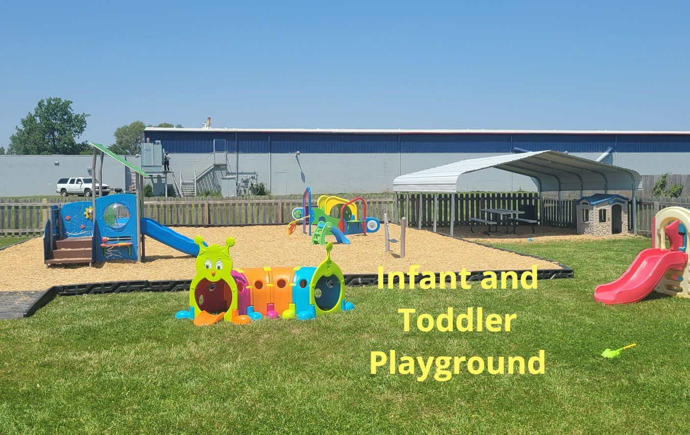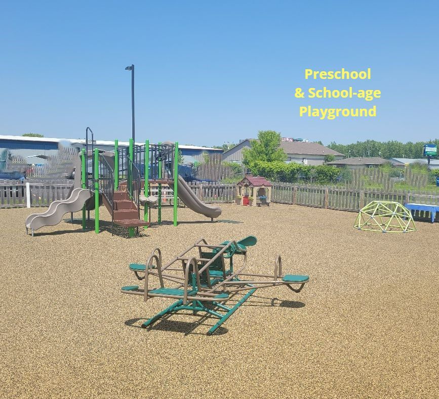 We have 2 fenced in outdoor playgrounds, one is for ages 2 to 12 and the other one os for our infants and toddlers. We also have a paved area that is fenced in to use for trikes/bikes, sidewalk chalk, basketball ect...